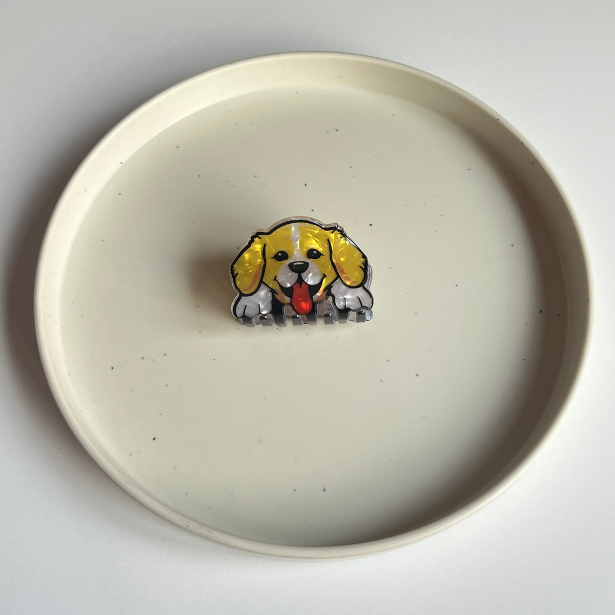 A golden-toned dog face hair claw with smooth edges and illustrated detailing. Lightweight and comfortable, it holds hair neatly without feeling heavy. Suitable for everyday casual looks.